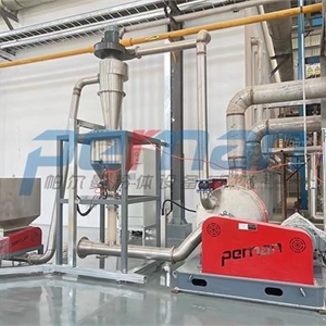 催化劑物料由加料系統均勻的送入粉碎室受到高速旋轉的粉碎盤的強烈沖擊,同時受到離心力的作用,與粉碎齒圈發生碰撞,受到剪切、摩擦、碰撞等多種綜合力的作用,使物料粉碎,被粉碎的物料隨氣流運動到分級區,通過變頻調節的分級輪,對粗細物料進行分離,符合細度要求的產品隨氣流進入旋風收集器和除塵器收集,粗物料返回分級區二次粉碎。